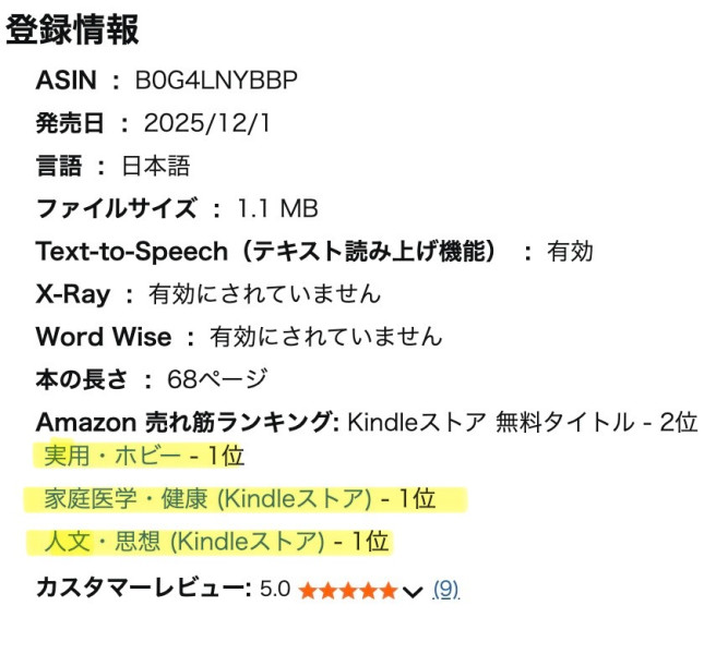 お陰様でR7年12月のAmazonダウンロード数5冠達成!全体ランキンげは2位を獲得することができました。